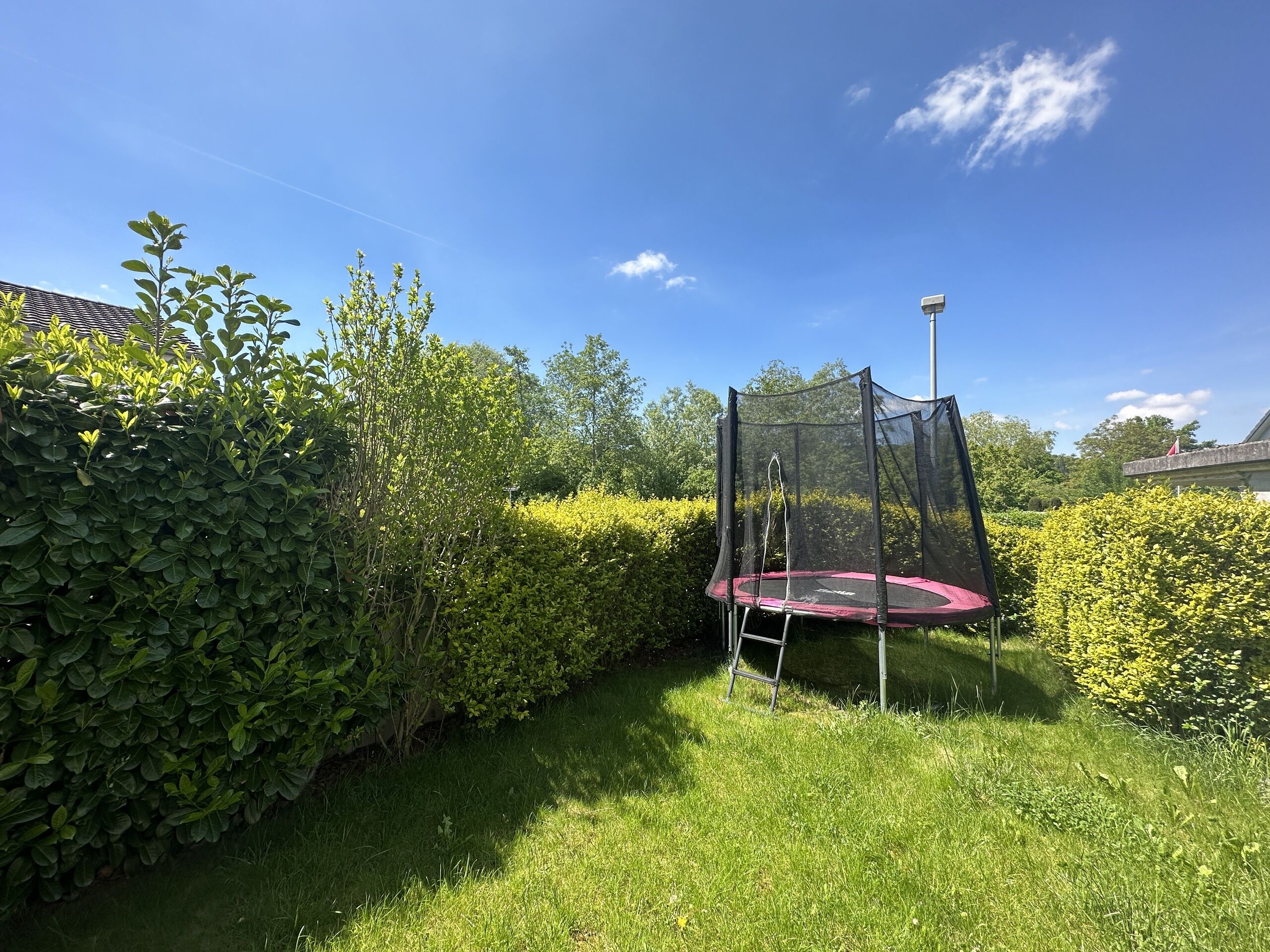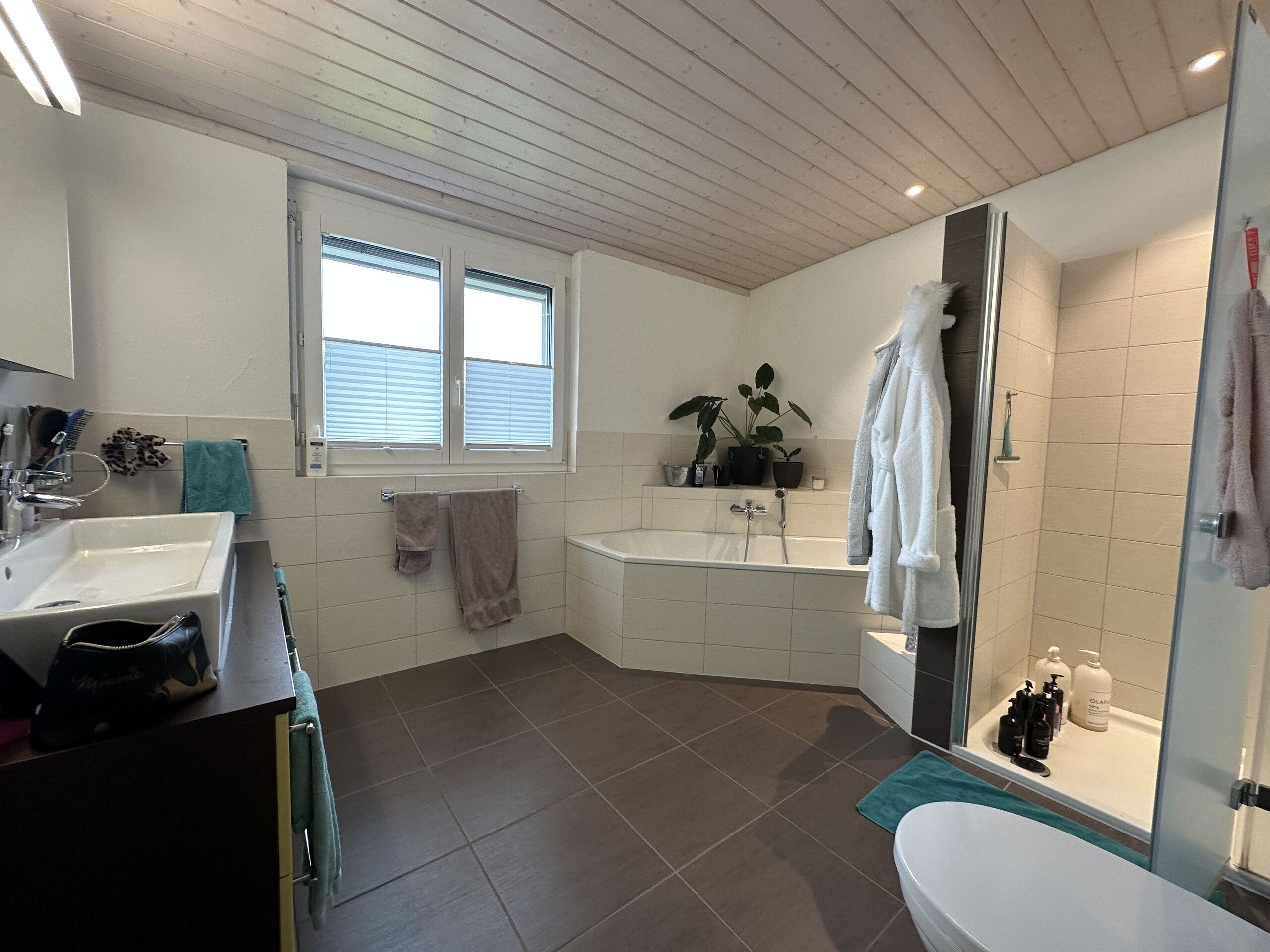 In der Küche selbst hat es weiteren Platz um einen Küchentisch zu platzieren. Hier kann in gemütlicher Runde für gut 4 Personen in der Küche gespeist werden. Ein Durchgang bringt Sie direkt in das Wohn-Esszimmer. Also für mehr Personen, oder wenn es eleganter sein soll, gibt es eine weitere Möglichkeit in dem kombinierten Wohn- und Esszimmer einen grossen Esstisch aufzustellen. Flankiert mit einem tollen, runden Schwedenofen ist hier das Wohlfühlambiente äusserst hoch. Ausserdem ist er auch sehr praktisch, da der Ofen auch eine gute Heizfunktion hat. (Generell wird das Haus mit Bodenheizung geheizt). Das grosszügige Zimmer lässt natürlich auch einen grossen Wohnbereich zu. Ausserdem gelangen Sie von hier auf die Überdachte Terrasse. Der Garten verfügt über genügend Platz um auch ein Trampolin oder eine Spielecke einzurichten.