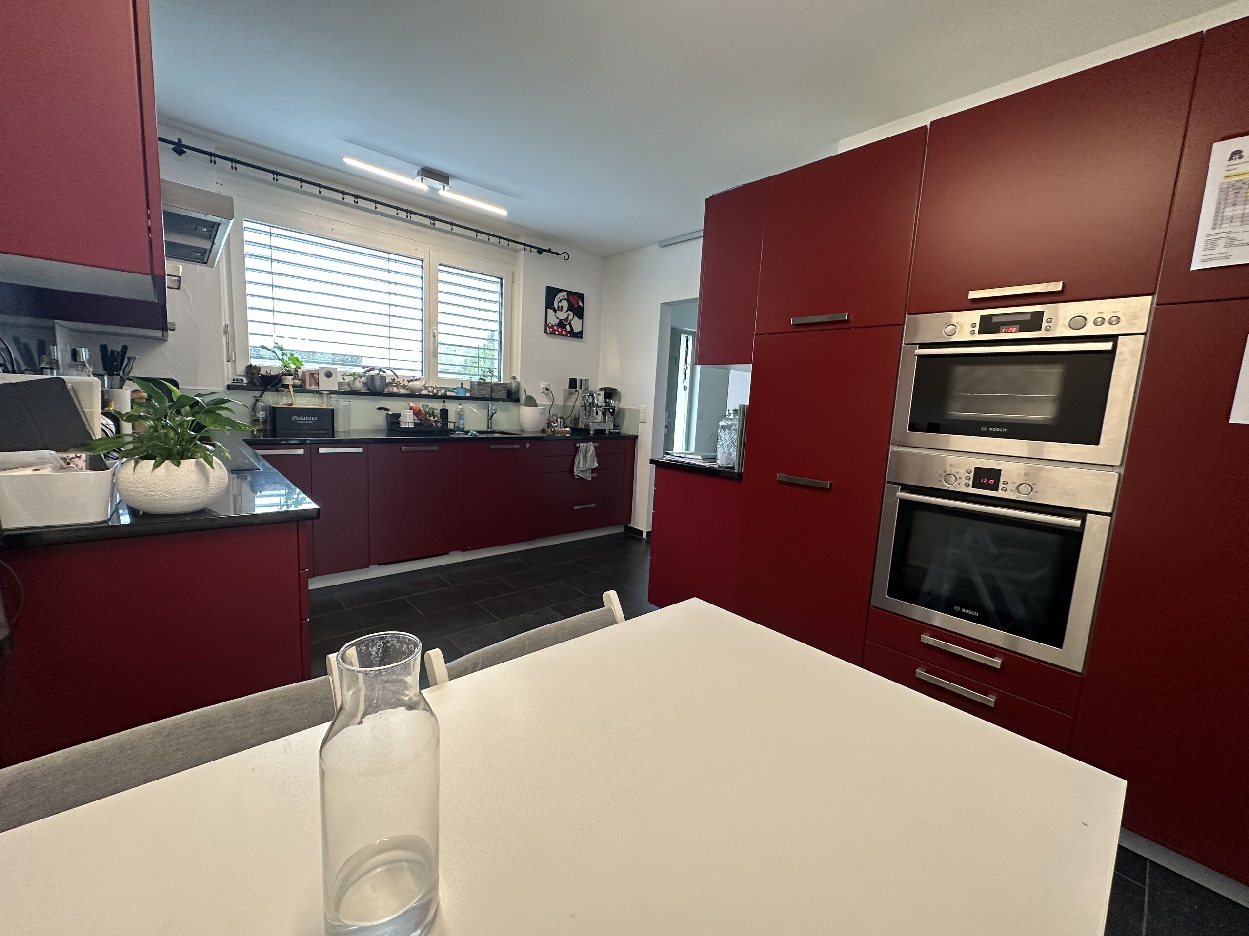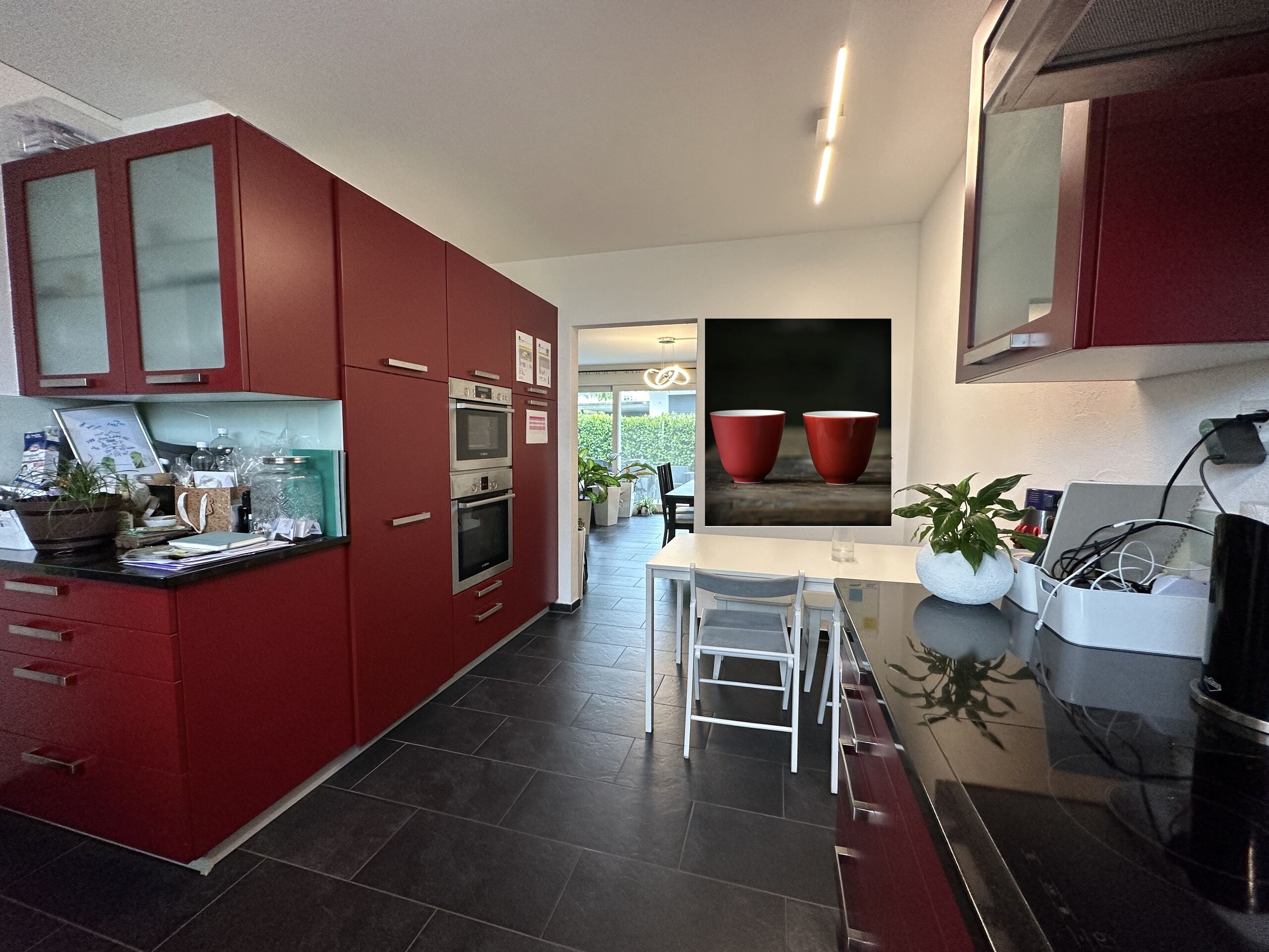 Neben dem Carport vorbei gelangen Sie über einen kleinen gepflegten Weg zu Ihrer Doppelhaushälfte. Ein sympathisches Entrée mit einem praktischen und grossen Garderobenschrank empfängt Sie und Ihre Gäste. Hier befindet sich ausserdem die Gästetoilette in fröhlichem und grünem Mosaik gehalten. Vom Gang aus gibt es Durchgänge in die Küche und ins Wohnzimmer. Die Küche ist sehr gross und praktisch mit viel Stauraum in stylishem Dunkelrot - abgerundet mit einer schöner schwarzen Arbeitsfläche. Ein Fenster darf in der Küche natürlich auch nicht fehlen.