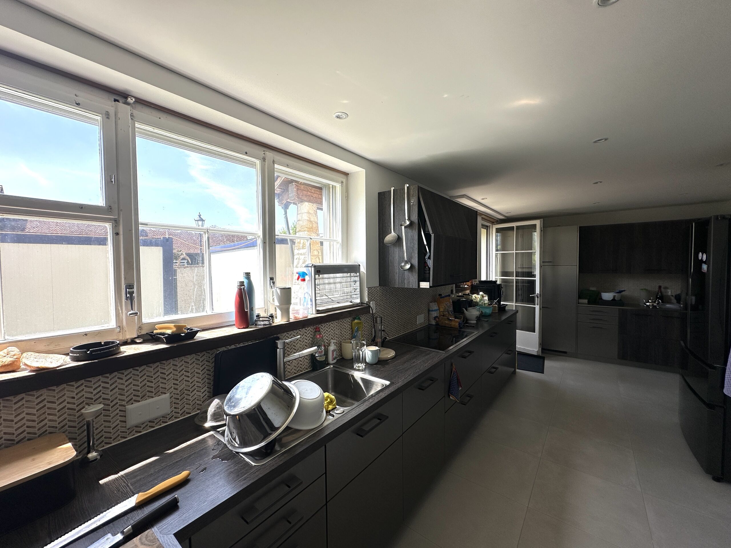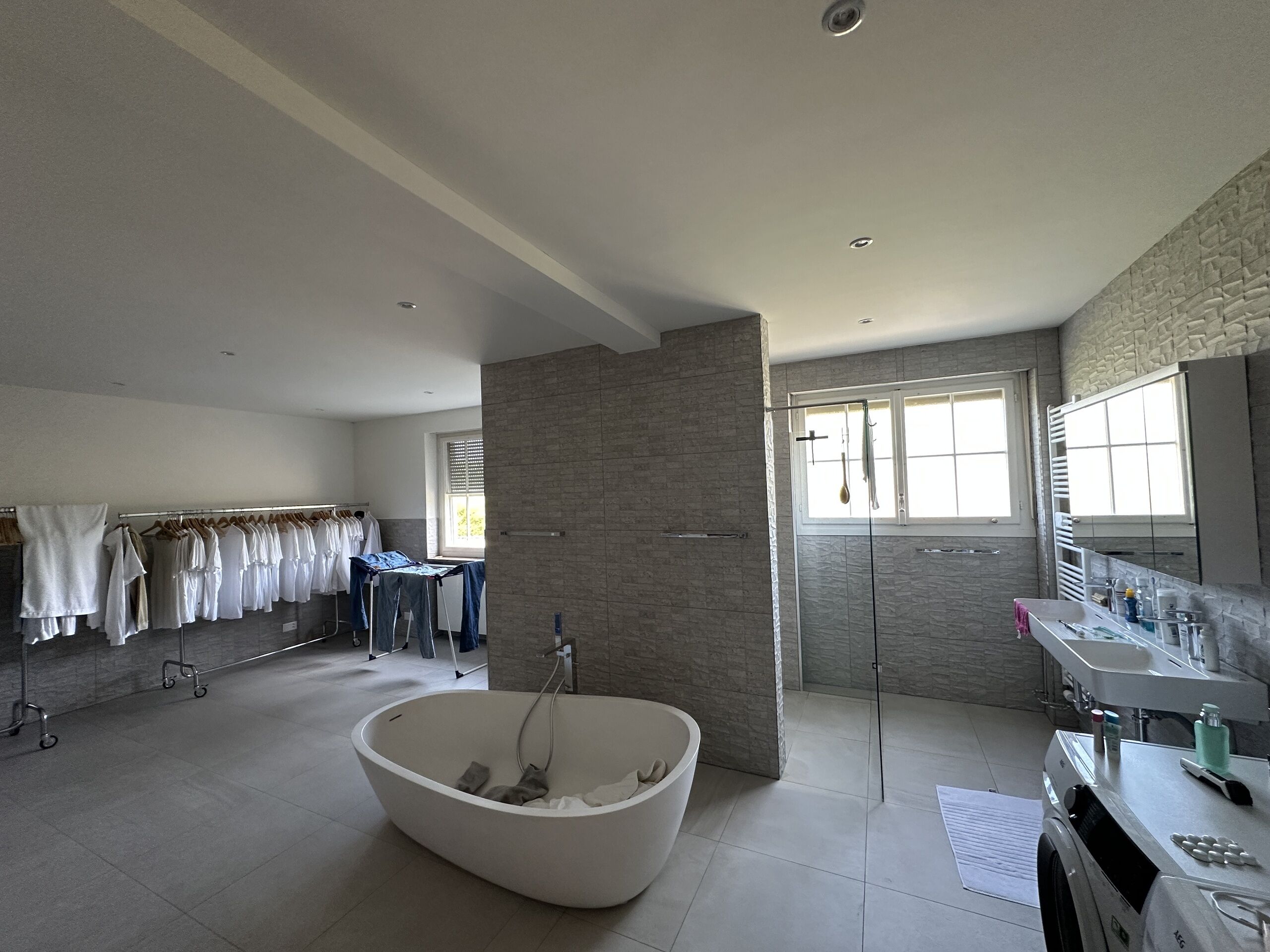 Die diversen Räume im EG: Esszimmer, Büro, Wohnzimmer - diese Räume mit einer grossen Fensterfront, TV Raum, Ankleide, Bad, Schlafzimmer sowie die seitlich gelegene Küche - all diese Räume sind hell und mit vielen Fenstern versehen.