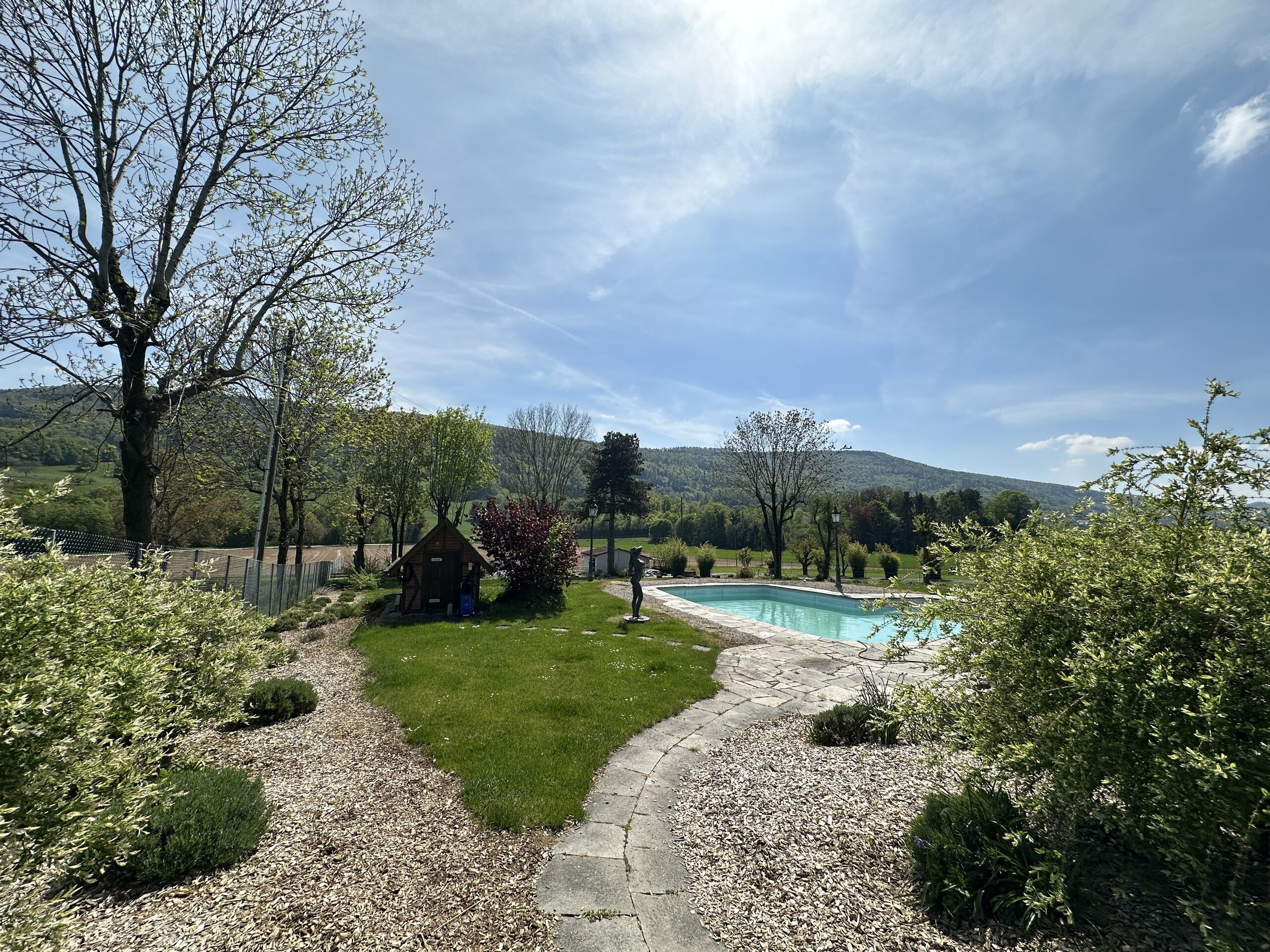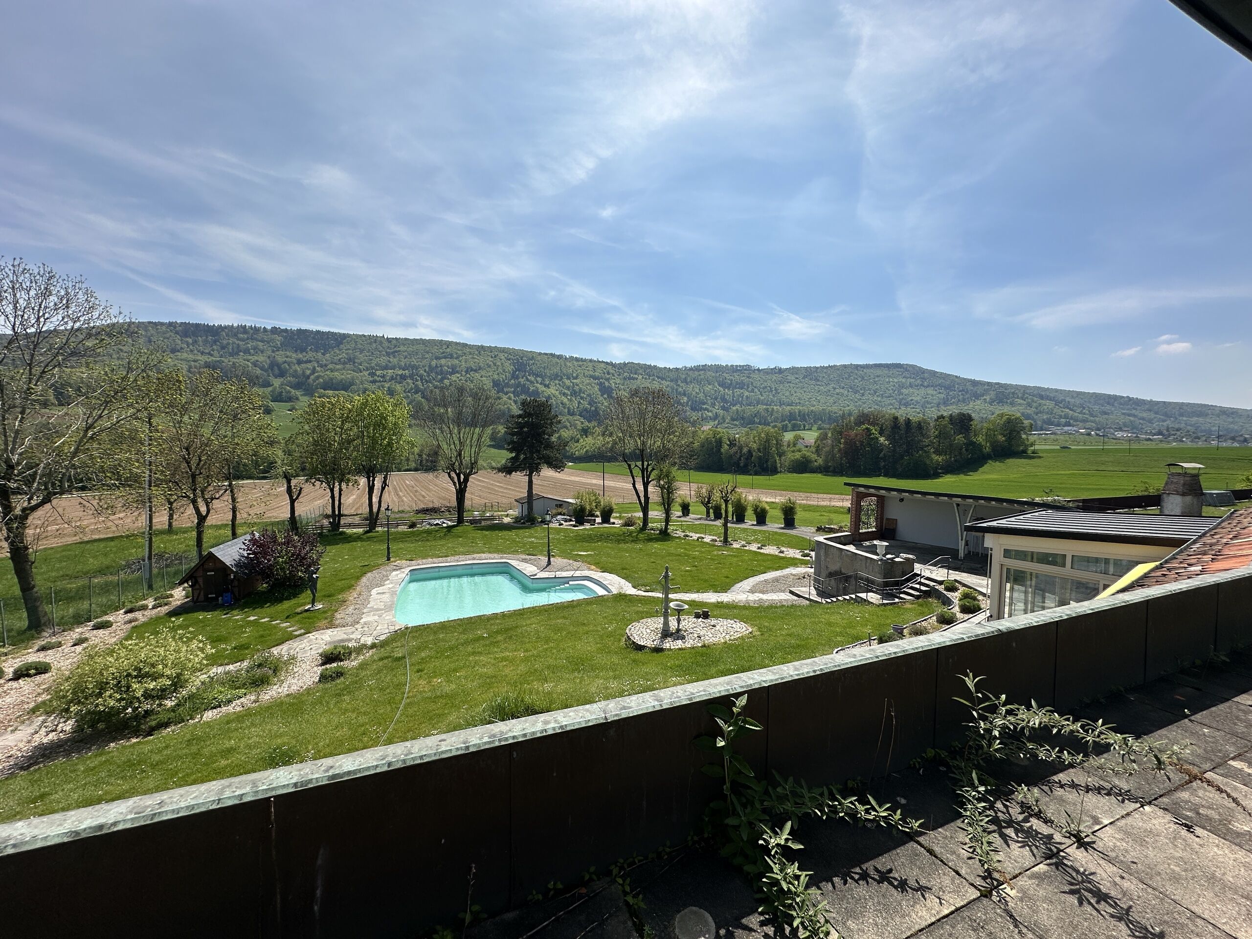 Der Garten, mit grosser offener Terrasse, schönen Pflanzen und einem Pool - dazu eine überdachte Terrasse mit stilvollem Aussenkamin bieten genügend Platz für viele Gäste und Mieter, die viel Platz benötigen.